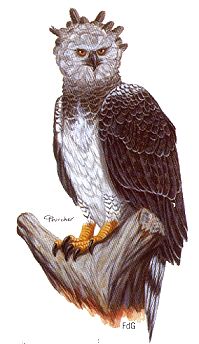 Zeer grote arend. Volle, dubbelpuntige kuif, die opgericht op horens lijkt. Grijze kop en keel contrasteren met de zwarte borst, nek en rug. Nekveren vormen een kraag. Vleugels relatief kort, rond, van boven zwart, met onduidelijke grijze banden, van onderen witachtig met donkere banden en vleugelrand. Vleugelbocht wit. Benedenborst en buik wit. Dijen wit met dicht op elkaar staande zwarte strepen.